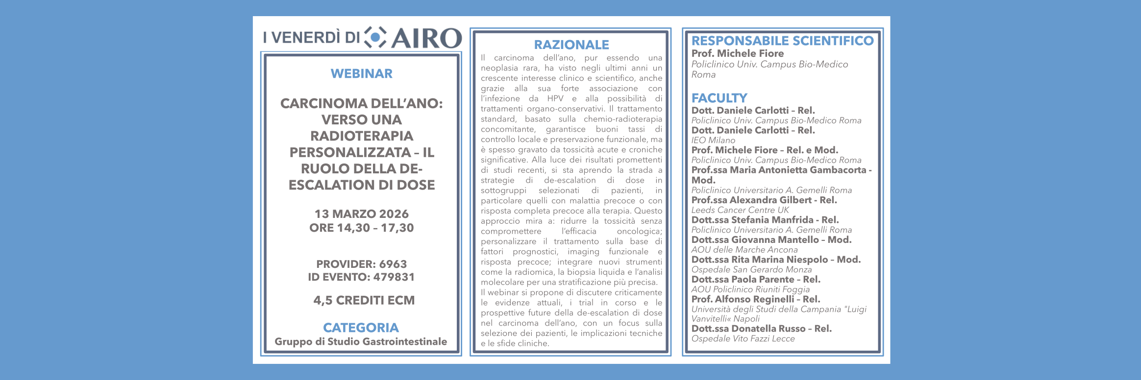 WEBINAR ECM I VENERDI’ DI AIRO – CARCINOMA DELL’ANO: VERSO UNA RADIOTERAPIA PERSONALIZZATA – IL RUOLO DELLA DE-ESCALATION DI DOSE – 13 Marzo 2026