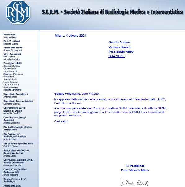 Messaggi di Cordoglio per la Scomparsa del Prof. Renzo CorvòOttobre 4, 2021 Dr. Carlo Cavedon – Presidente AIFM AIFM – Associazione Italiana di Fisica Medica e Sanitaria SNR – Sindacato Nazionale Area Radiologica Dott. Vittorio Miele – Presidente SIRM Tag:homepage