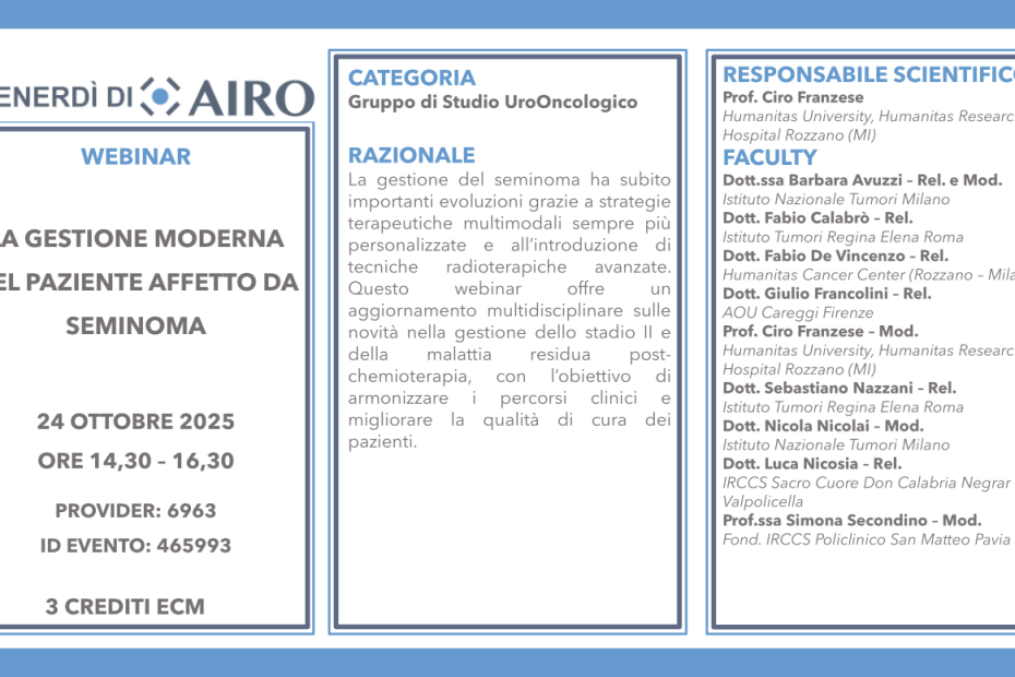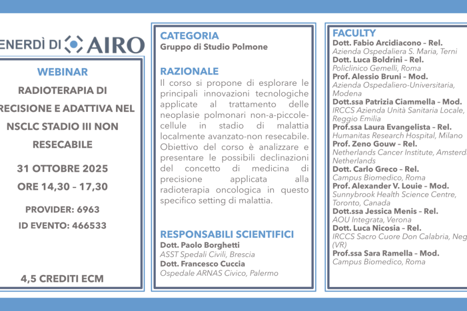 WEBINAR ECM I VENERDI’ DI AIRO – RADIOTERAPIA DI PRECISIONE E ADATTIVA NEL NSCLC STADIO III NON RESECABILE – 31 Ottobre 2025